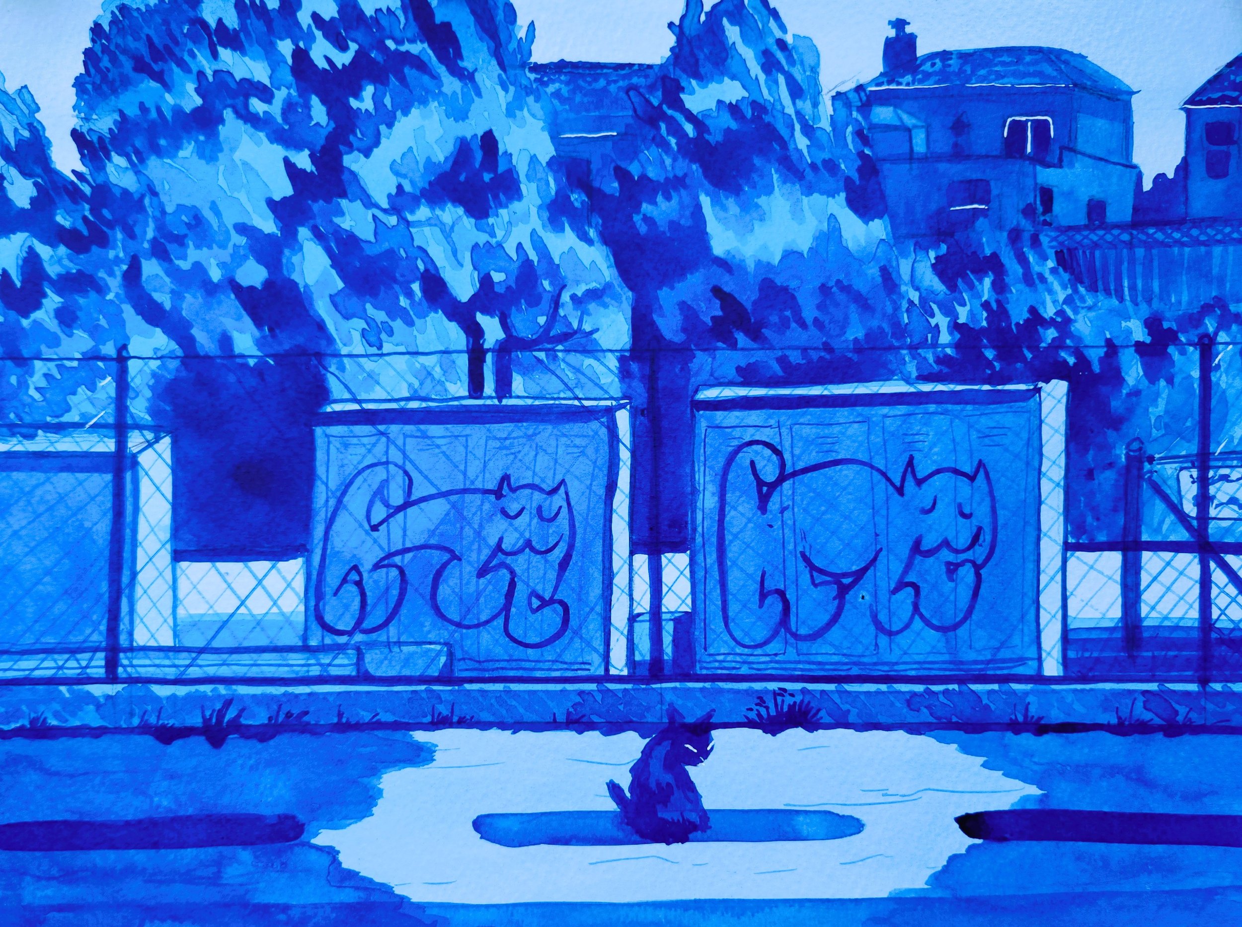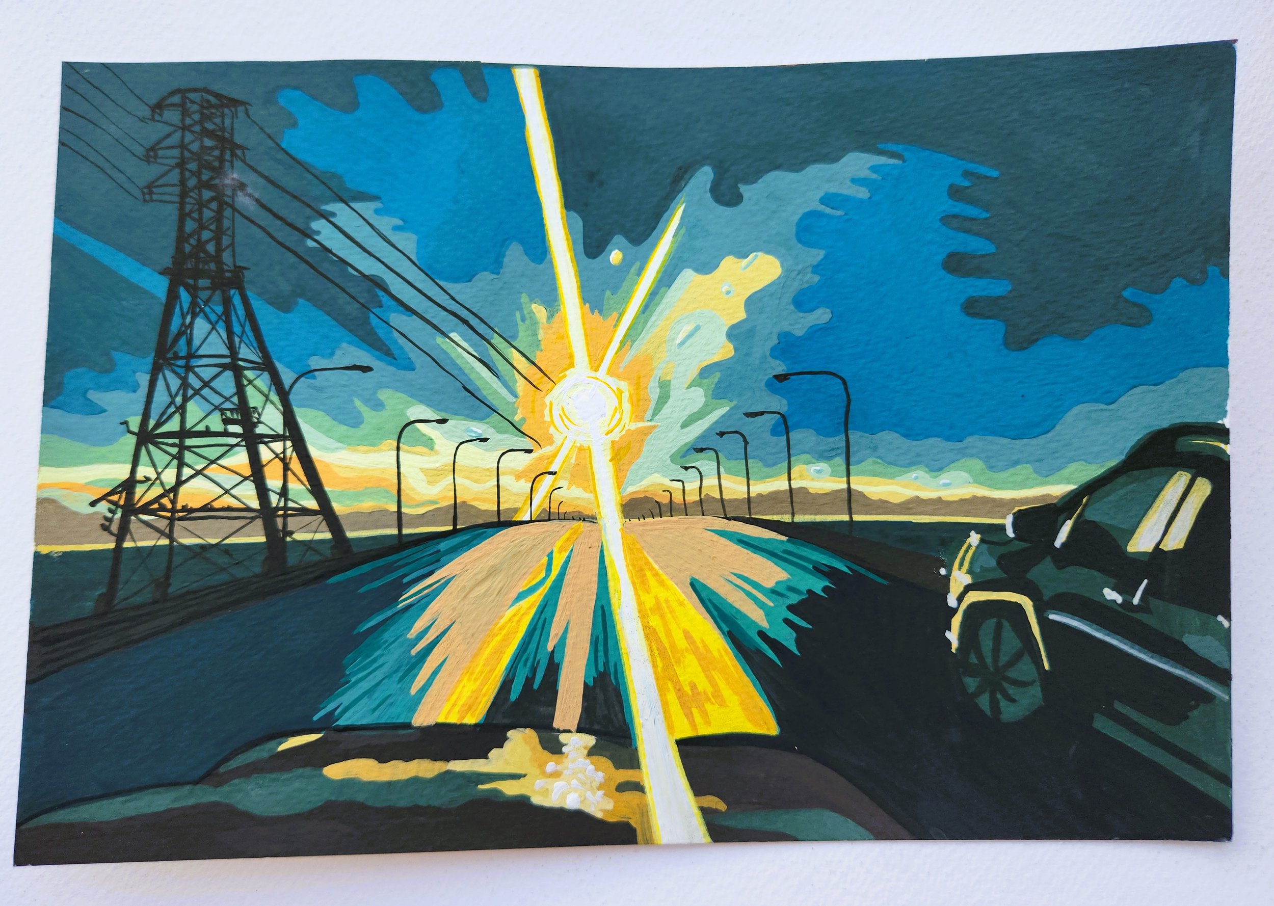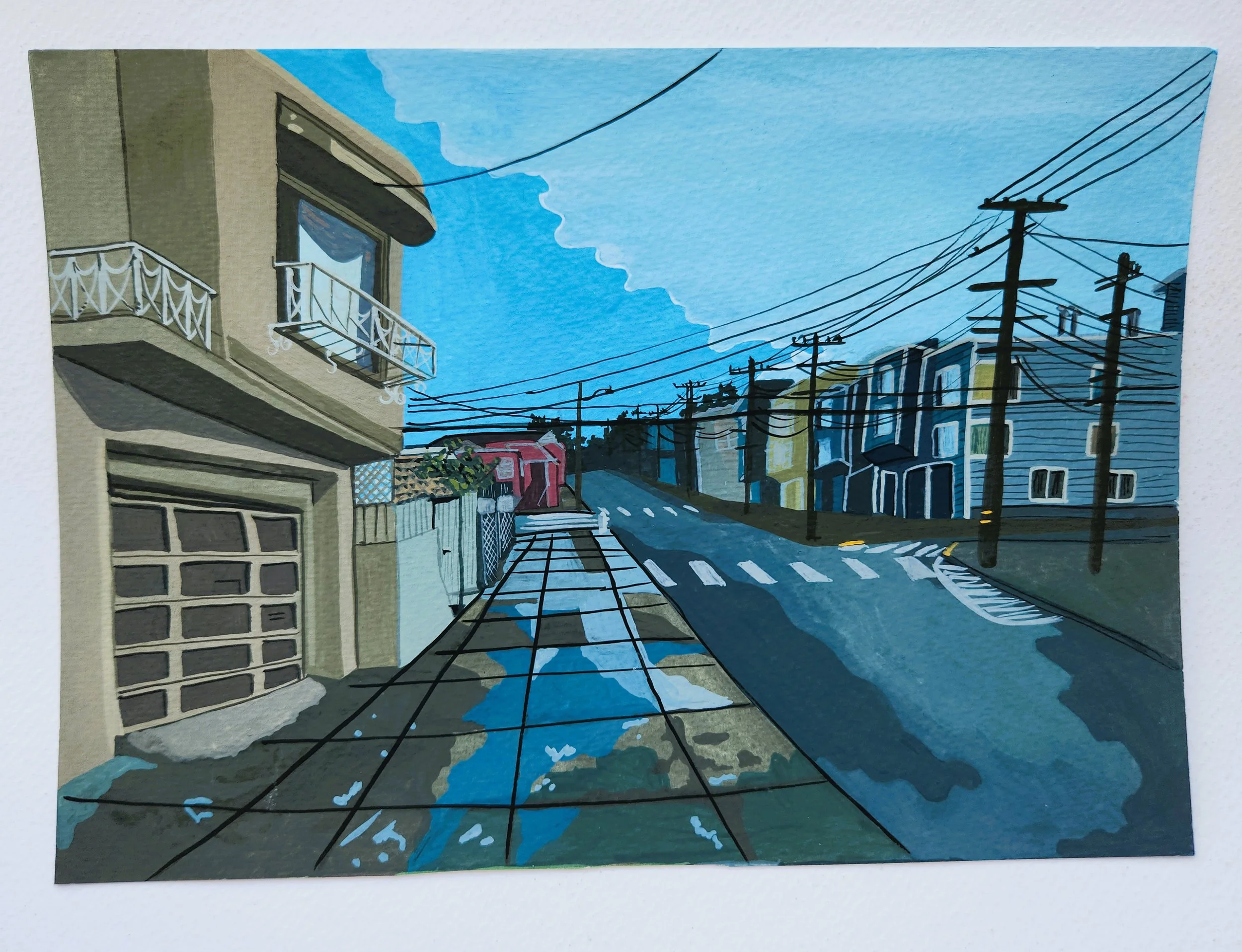 In contrast, my gouache paintings explore the isolation that lingers beyond digital spaces. The empty, stylized landscapes I paint mirror my experience of navigating both the virtual and physical world, reflecting the solitude that remains when the performance and masking of identity falls away.